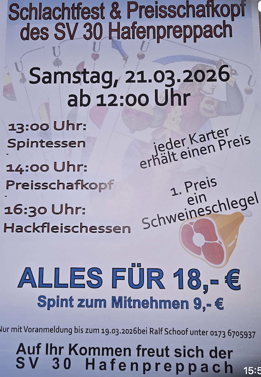 Teilnehmerzahl begrenzt aufgrund von Platzverhältnissen. Um rechtzeitiges Erscheinen wird gebeten. Schneider 09135 210100 kurzes Blatt, mit Solo und Wenz